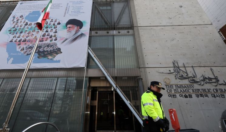 11일 외교가에 따르면 대사관 측은 최근 하메네이 전 최고지도자 사진과 함께 '세계는 언제 전쟁범죄자들에게 책임을 물을 것인가'라는 뜻의 영어 문구가 적힌 현수막을 대사관 외벽에 게시했다.