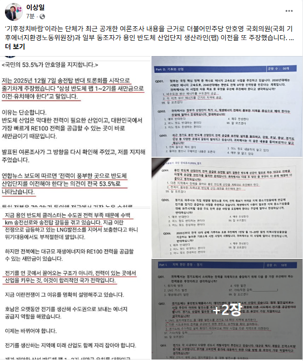 이 시장은 11일 자신의 SNS를 통해 특히 해당 단체의 여론조사가 지닌 '정보의 비대칭성'과 '의도적 누락'을 매섭게 질타했다. 그는 "정부가 이미 용인 첨단시스템반도체 국가산단(삼성전자)과 용인반도체클러스터 일반산단(SK하이닉스)에 대한 전력 공급 계획을 수립했으며, 이를 이행할 책임이 정부에 있다는 핵심 사실이 설문에서 쏙 빠졌다"고 지적했다.
