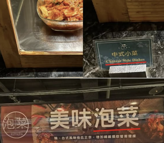 대만 곳곳에 김치 표기 오류가 심각한 것으로 알려졌다. 김치를 중국 반찬(Chinese Side Dishes)이라고 적는가 하면, 파오차이(泡菜)로 표기해 판매하는 경우도 많은 상황이다.
