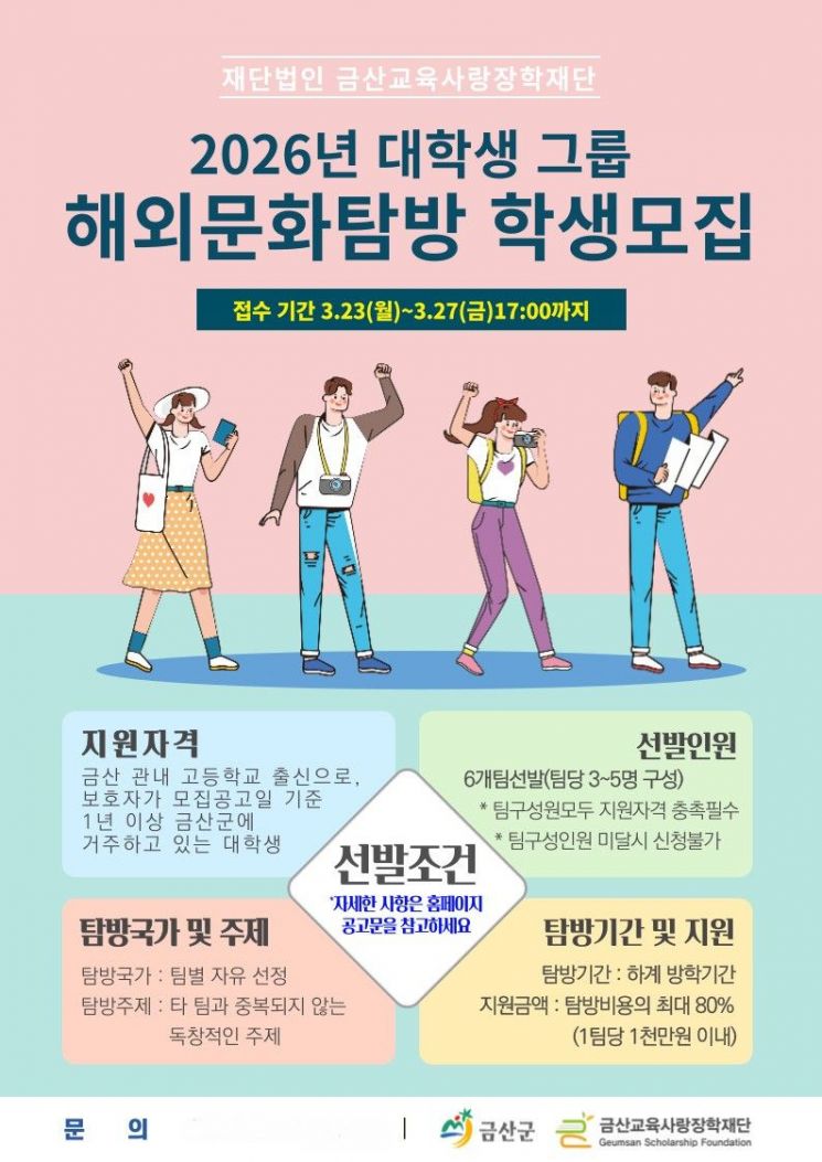 금산교육사랑장학재단이 금산지역 고교 출신 대학생들에게 글로벌 문화 탐방 기회를 제공하는 3기 대학생 그룹 '해외문화탐방' 학생을 모집한다.