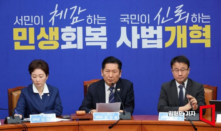 검찰개혁과 관련해 정 대표는 "검찰개혁은 이재명 정부와 민주당의 깃발이고 상징이다. 이 깃발이 찢어지지 않도록, 상징이 얼룩지지 않도록 제가 하겠다"며 "요란하지 않게 긴밀하게 물밑에서 조율하겠다"고 했다.