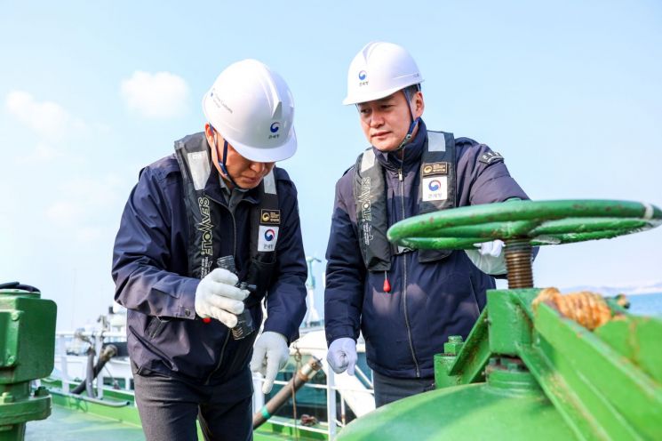 이종욱 관세청 차장(오른쪽)이 12일 부산항에서 입항한 국제무역선의 해상 면세유 공급 체계 전반을 점검하고 있다. 이 차장은 현재 관세청 중동상황 비상대응 TF 단장을 맡고 있다. 관세청