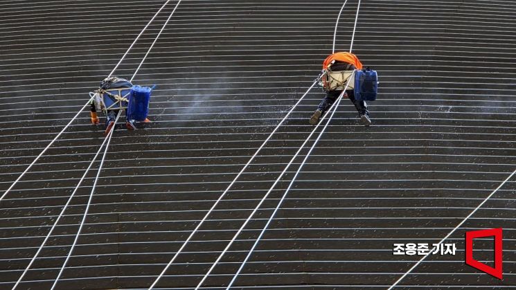 봄이 왔다. 겨우내 쌓였던 먼지와 묵은 때를 털어내듯, 봄을 맞은 도심의 빌딩들이 물청소로 새 단장을 하고 있다. 이 작은 봄맞이 행사는 도심에도 계절의 변화가 스며들고 있음을 보여준다. (서울 종로)