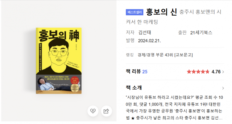 '충주맨'으로 이름을 알린 김선태 전 주무관의 개인 유튜브 채널 구독자 수가 143만명을 넘긴 가운데, 그의 저서 '홍보의 신'이 재조명되며 판매량도 급증했다.