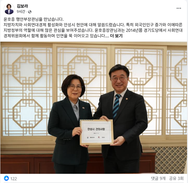 김 시장은 이날 자신의 SNS를 통해 윤 장관과의 면담 사실을 알리며 지방자치 발전과 사회연대경제 활성화, 안성시의 당면 과제들에 대해 깊이 있는 의견을 나눴다고 밝혔다.