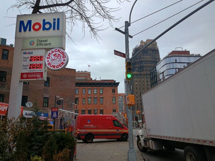 12일(현지시간) 오후 12시 30분 미국 뉴욕시 잭슨스퀘어 근처의 주유소 '모빌'(Mobil)에 도착하자 주유 중인 차 2대를 비롯해 다른 차량 3대가 대기 중이었다. 이 주유소는 다른 지역보다 비싼 편임에도 불구하고 차량들이 계속 찾아왔다. 미국과 이스라엘의 이란 공습(2월28일) 시작 후 약 2주가 지난 이날 주유소 휘발유 가격은 갤런당 4.89달러(현금)였다. 국제유가가 급등하면 소매가에 반영되기까지 약 2~4주의 시간이 걸린다는데, 지난주부터 기름값이 오르면서 갤런당 5달러에 육박하게 됐다.