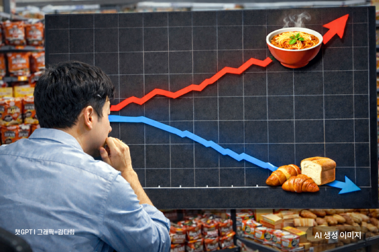 라면값 상승률은 7%대까지 치솟은 반면 빵 가격 상승률은 올해 들어 1%대까지 떨어졌다.