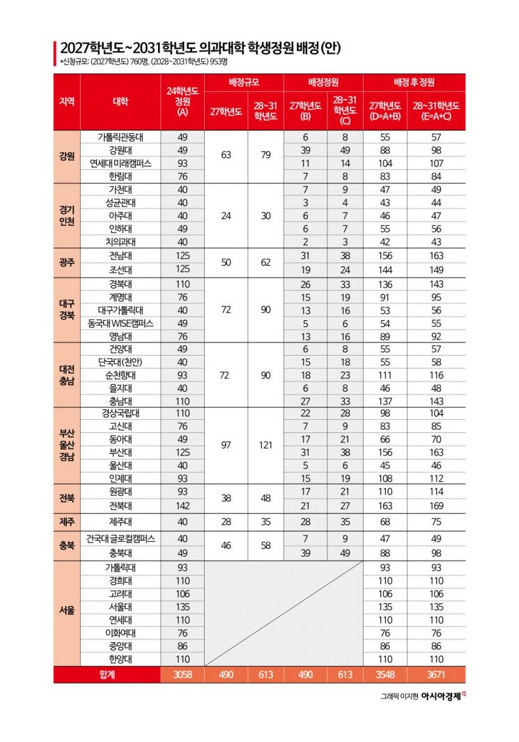 정부가 2027학년도 의대 증원분을 반영한 대학별 배정을 마쳤다. 전국 40개 의대 총 정원은 2024학년도 3058명에서 490명 증가한 3548명이며, 증원분은 서울을 제외한 32개 대학서 전원 '지역의사제'로 선발한다. 증원 규모가 가장 큰 곳은 강원대와 충북대로 39명씩 늘어난다.