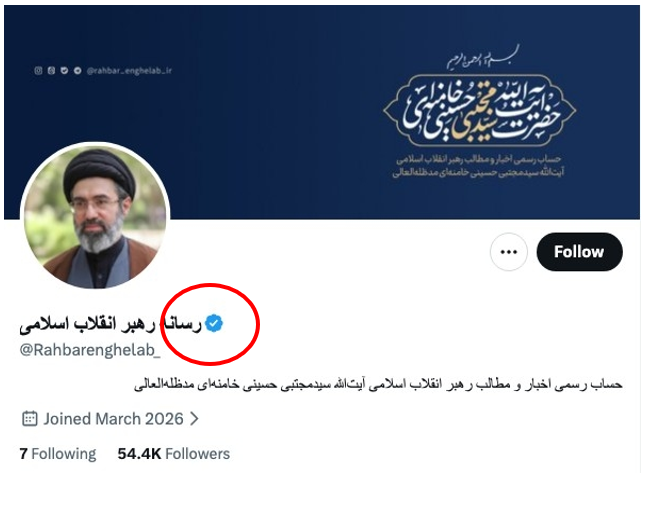12일(현지시간) 모즈타바 하메네이의 공식 X 계정 '@Rahbarenghelab_'에는 흔히 '파란 딱지'로 불리는 유료 구독자 전용 '파란색 체크 마크' 인증이 붙어 있다. X의 유료 구독자가 되면 기본 280자인 글자 수 제한이 해제돼 장문의 글을 쓸 수 있고, 길이가 긴 고화질 동영상도 올릴 수 있다. 또 검색 결과 등에서 유료 구독자의 글이 최상단에 우선해 노출되기도 한다.