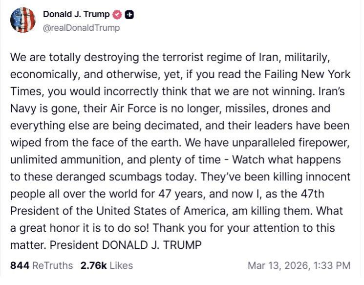 트럼프 대통령은 13일(현지시간) 자신의 사회관계망서비스(SNS) 트루스소셜에서 "이란 해군은 사실상 사라졌고 공군도 더 이상 존재하지 않는다"며 "미사일과 드론 및 다른 모든 것들도 계속 파괴되고 있으며 그들의 지도자들도 지구상에서 제거됐다"며 이같이 밝혔다.