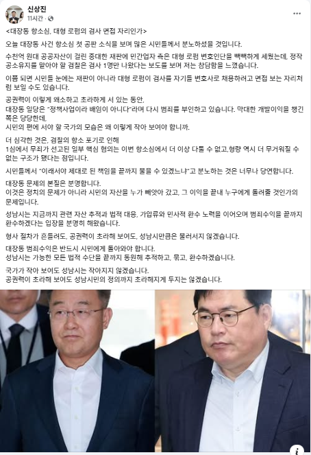 신상진 시장은 지난 13일 자신의 사회관계망서비스(SNS)를 통해 "대장동 사건 항소심 첫 공판에서 민간업자 측은 태평양, 광장 등 국내 유수의 대형 로펌 변호인단을 대거 투입해 세를 과시했다"며 '대장동 항소심, 대형 로펌의 검사 면접 자리인가'라는 제목의 글을 올려 공권력의 위축을 강도 높게 비난했다.