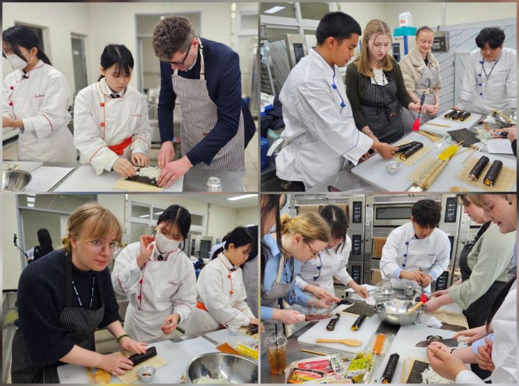 칼질마저 서툴러 썰어낸 김밥의 두께는 삐뚤빼뚤 제멋대로였지만, 실습실 안은 내내 신기해하는 탄성과 유쾌한 웃음소리로 가득 찼다. 비록 모양새는 엉성해도, 두 나라 학생들은 함께 재료를 올리며 국경을 초월한 우정만큼은 둥글고 단단하게 말아내고 있었다.