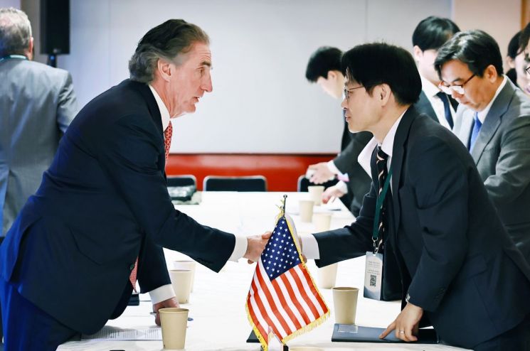 김정관 산업통상부 장관(오른쪽)이 15일 일본 도쿄에서 열린 ‘제1차 인도·태평양 에너지 안보 장관회의 및 비즈니스 포럼’ 참석을 계기로 더그 버검(Doug Burgum) 미국 국가에너지위원회 위원장 겸 내무부 장관과 만나 인사를 나누고 있다.산업통상부