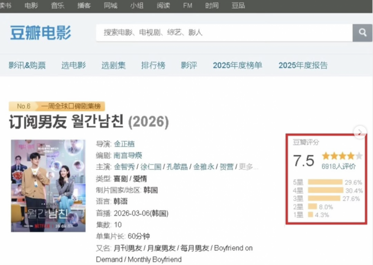 서 교수에 따르면 중국 최대 리뷰 사이트 더우반에는 현재 '월간 남친'에 관한 리뷰 페이지가 만들어진 상태다. 17일 기준으로 별점 평가에 7000여명이 참여했으며 리뷰는 약 3500개가 달려있다.