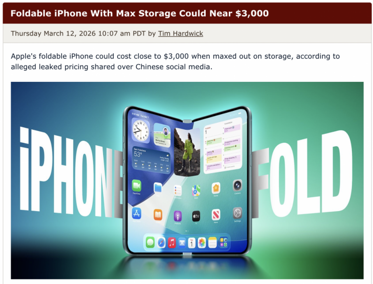 18일 맥루머스 등 IT 전문 외신들은 하반기 출시 예정인 애플의 첫 폴더블 스마트폰 가격을 2320달러(약 346만원·256GB 저장공간 기준) 수준으로 예상했다. 애플 폴더블 스마트폰의 가격과 저장공간 정보가 유출됐다며 이같이 보도했는데, 가장 큰 저장공간을 가진 1TB 모델은 가격이 2900달러(약 433만원) 수준이라고 전했다.