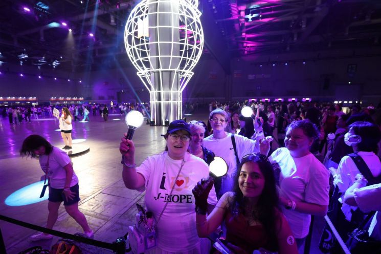 지난해 6월께 경기 고양시 일산서구 킨텍스에서 열린 방탄소년단 데뷔 12주년 기념 축제 '2025 BTS 페스타'(2025 BTS FESTA)에서 프랑스에서 온 아미들이 응원봉을 흔들고 있다. 연합뉴스