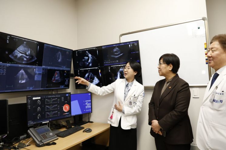 윤연이 분당서울대학교병원 순환기내과 교수(왼쪽)가 정은경 보건복지부 장관에게 인공지능(AI) 기반 심초음파 분석 소프트웨어를 이용해 환자의 심초음파 지표를 측정하고 영상을 판독하는 과정을 설명하고 있다. 분당서울대학교병원.