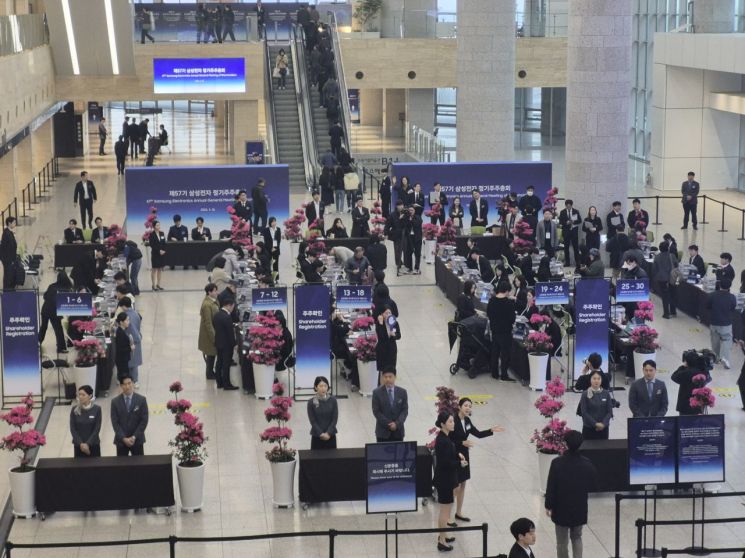 18일 오전 8시 제57기 삼성전자 정기주주총회가 열린 수원 컨벤션센터. 우산과 옷에 묻은 물기를 털어내야 하는 궂은 날씨였지만, 주총 현장으로 향하는 삼성전자 주주들의 발걸음은 그 어느 때보다 가볍다. 지난해 주총이 회사의 고대역폭메모리(HBM) 실기에 대한 주주들의 '성토의 장'이었다면, 올해 주총 입장권을 쥔 주주들의 얼굴에는 '드디어 삼성이 반격에 나선다'는 기대감이 역력했다.