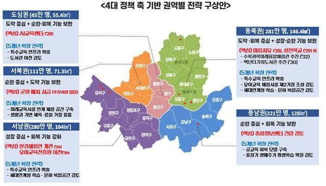 동북권과 서남권에는 특수교육 인프라를 확충하고, 시니어 대학 등 세대 연계형 학습·문화 복합공간을 검토하기로 했다. 서북권에는 미래교육시설 연계 체험 공간을 구축하며 사교육 밀집 지역인 동남권에는 공교육 회복 모델을 구축하는 데 주력한다. 도심권에서는 특수학교를 설립하고, 중장기 도서관도 재배치할 계획을 세웠다.