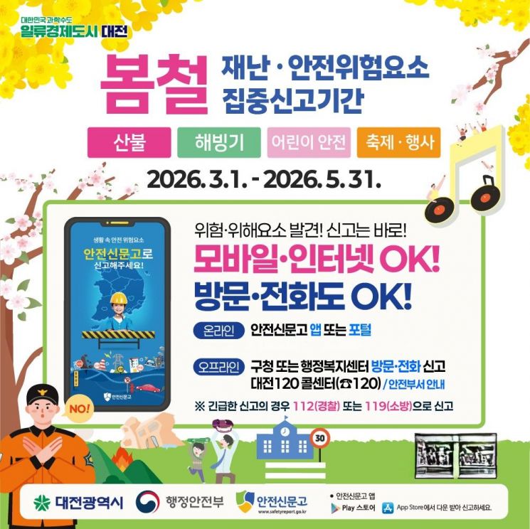 신동헌 시민안전실장은 "시민 여러분의 작은 관심과 신고가 더 큰 사고를 예방하고 더욱 안전한 대전을 만드는 힘이 된다"며 "온라인 신고가 익숙하지 않은 시민들께서도 대전 120콜 센터나 가까운 행정복지센터 등 오프라인 창구를 통해 안전 신고에 적극 참여해 주시길 바란다"고 말했다.