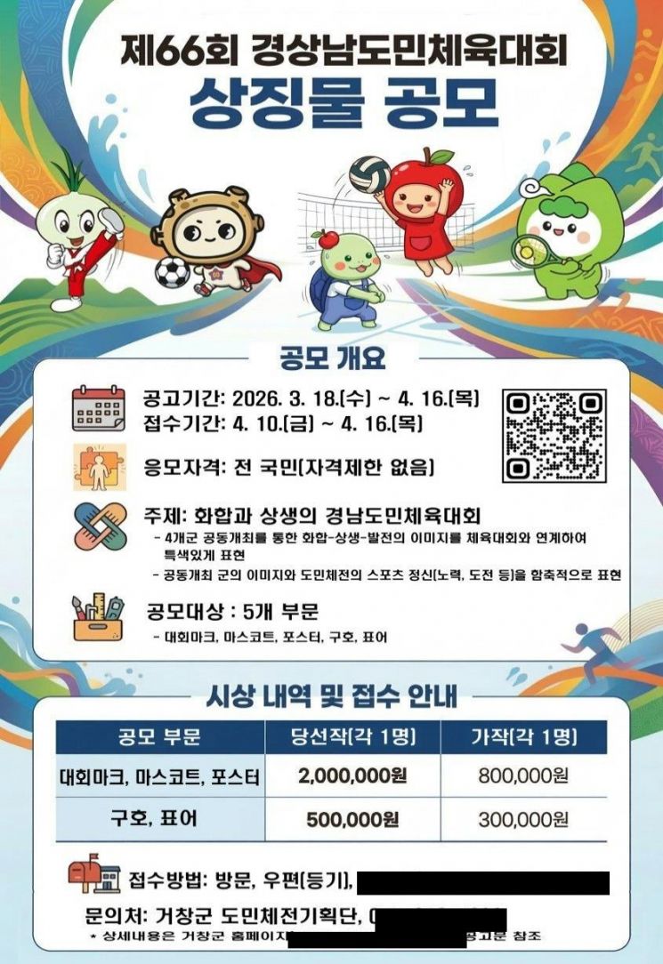 거창·산청·함양·합천 서북부 경남 4개 군은 2027년에 개최되는 「제66회 경상남도민체육대회」의 성공적인 개최와 범도민 참여 분위기 조성을 위해 상징물 공모를 진행한다.