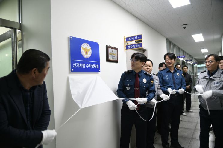 거창경찰서는 이날 통합수사팀 사무실 앞에서 경찰서장과 각 과장, 수사·형사팀장 등이 참석한 가운데 선거사범 수사상황실 현판식을 개최했다.