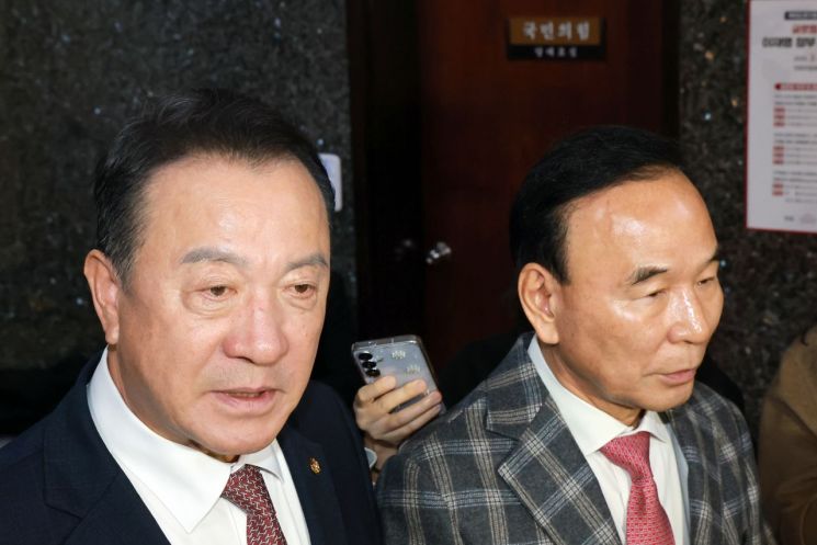 충북을 지역구로 둔 국민의힘 박덕흠(오른쪽) 의원과 엄태영 의원이 18일 국회에서 충북도지사 공천과 관련해 장동혁 대표와 면담한 뒤 취재진 질문에 답하고 있다. 연합뉴스