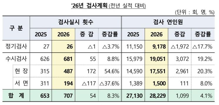 올해 총 검사 횟수는 707회로, 지난해(653회)보다 8.3% 확대된다. 검사 인원 역시 지난해 2만7130명에서 올해 2만8229명으로 4.1% 늘린다.