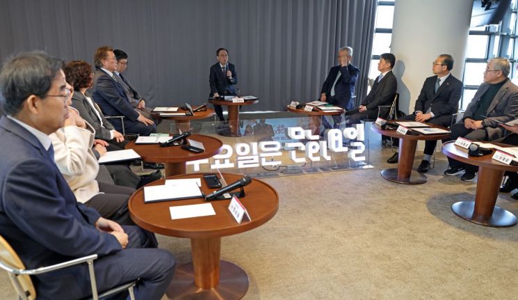 김영수 문화체육관광부 제1차관(오른쪽 다섯 번째)이 18일 서울 종로구 아트코리아랩에서 열린 문화가 있는 날 확대를 위한 업무협약식에서 인사말을 하고 있다. 문화체육관광부