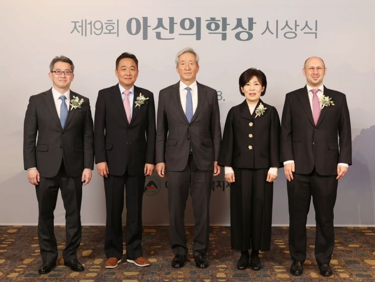 (왼쪽부터) 젊은의학자부문 이주명 성균관의대 삼성서울병원 순환기내과 교수, 임상의학부문 김승업 연세의대 세브란스병원 소화기내과 교수, 정몽준 아산재단 이사장, 기초의학부문 이호영 서울대 약학과 교수, 젊은의학자부문 마틴 슈타이네거 서울대 생명과학부 교수. 아산재단