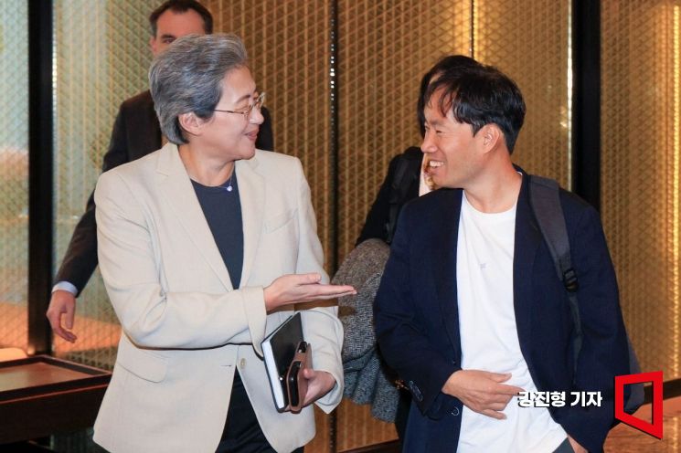 리사 수 AMD 최고경영자(CEO)와 김성훈 업스테이지 대표가 19일 서울 종로구 포시즌스 호텔에서 회동을 마친 뒤 이동하며 대화 하고 있다.