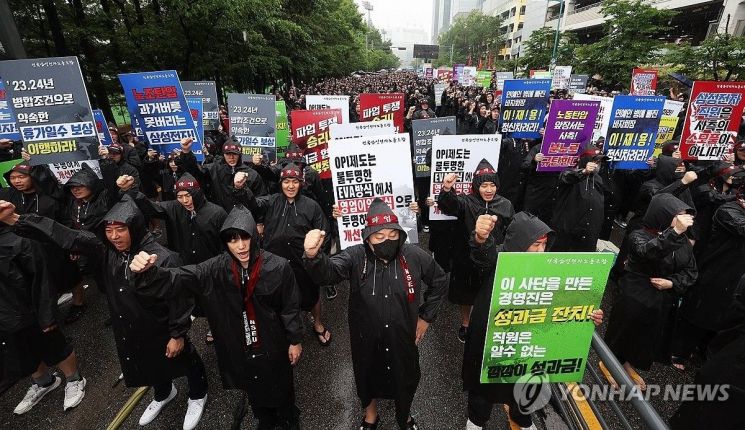 지난 2024년 7월 8일 오전 경기도 화성시 삼성전자 화성사업장 앞에서 열린 전국삼성전자노동조합 총파업 결의대회에서 조합원들이 구호를 외치고 있다. 연합뉴스.