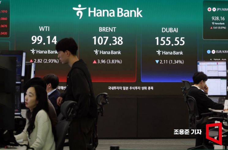 서부텍사스유(WTI)가 한때 100달러를 돌파한 가운데 19일 서울 하나은행 본점 딜링룸에 국제유가 정보가 표시되고 있다. 이날 코스피는 전 거래일 대비 2.76% 내린 5761.40에 원·달러 환율은 21.9원 오른 1505원으로 장을 시작했다.