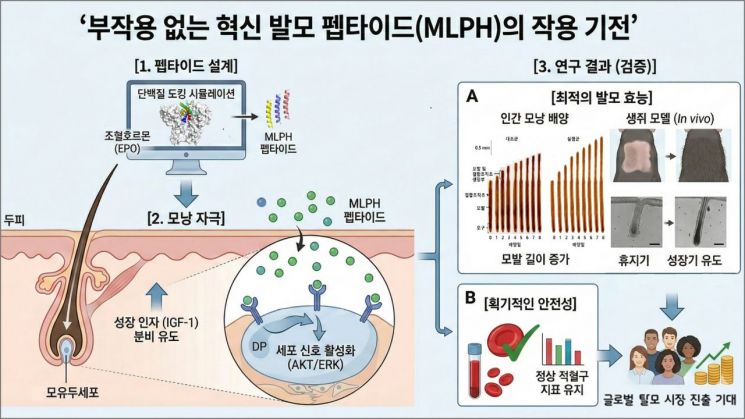 컴퓨터 단백질 모델링으로 설계한 신규 펩타이드(MLPH)가 모낭 유두세포에 작용해 발모를 유도하는 과정과 동물·인체 조직 실험에서 확인된 효과 및 부작용 없는 안전성을 단계적으로 보여주는 모식도. 연구팀 제공