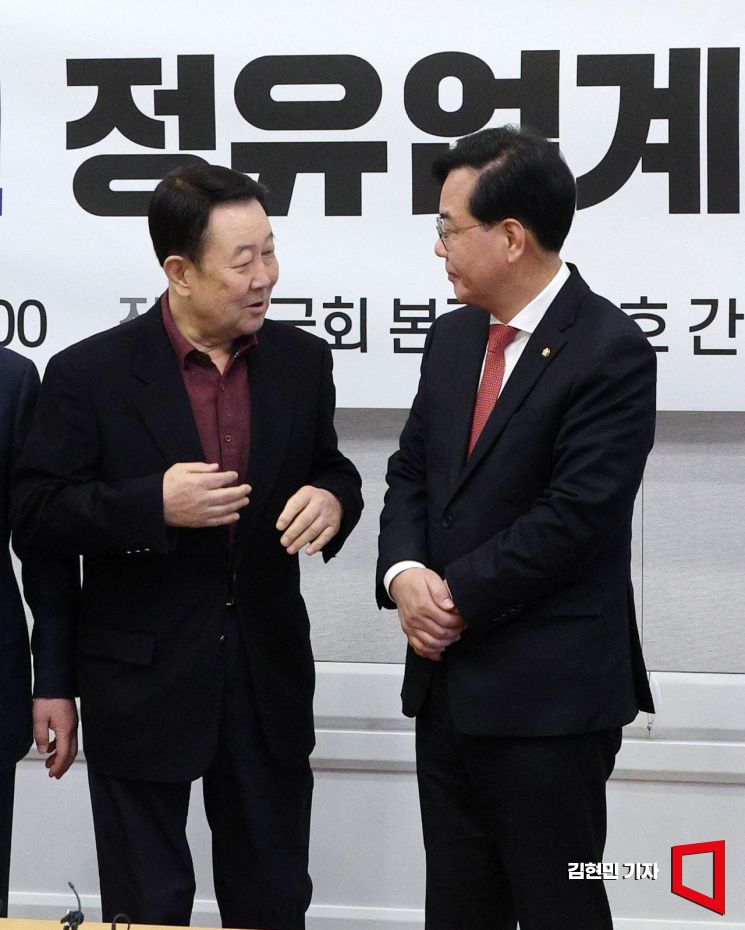 송언석 국민의힘 원내대표가 19일 국회에서 열린 중동사태 관련 정유업계 대표와의 정책간담회에서 박주선 대한석유협회장과 대화하고 있다.