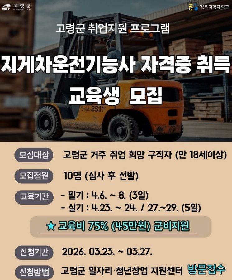 경북 고령군은 19일 구직자의 취업 역량 강화를 위해 「고령군 일자리·청년창업지원센터」주관으로 지게차운전기능사 취득 지원사업 교육생을 모집한다고 밝혔다.