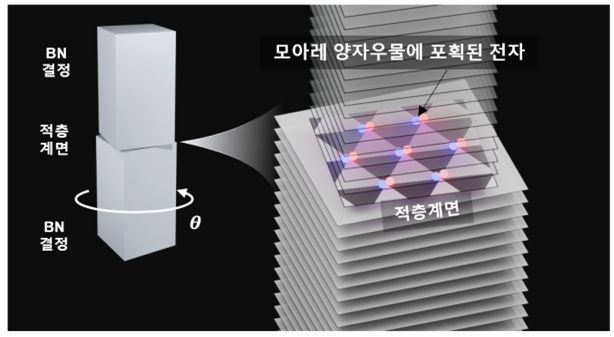이번 연구의 핵심은 '비틀어 쌓는 구조'다. 연구팀은 원자층 사이가 약한 힘으로 결합된 반데르발스 반도체 소재인 질화붕소(BN)를 활용해, 서로 다른 각도로 적층할 경우 전자를 강하게 가둘 수 있는 새로운 양자 구조가 형성된다는 점을 확인했다. 이 구조는 '모아레 양자우물'로, 나노미터 크기 공간에 전자를 가둬 고에너지 빛을 효율적으로 방출할 수 있다.