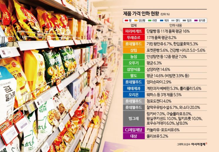 24일 식품 업계에 따르면 과자와 빵, 아이스크림 등 일부 제품 가격이 다음 달 1일부터 최대 13.4% 인하된다.