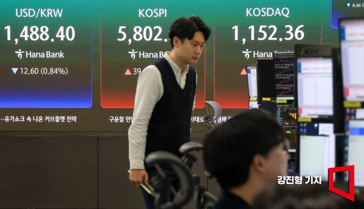 코스피 지수가 전 거래일 대비 50.13포인트 상승한 5813.35로 장을 시작한 20일 서울 중구 하나은행 본점 딜링룸 전광판에 국내증시 현황이 표시돼 있다. 이날 원달러 환율은 전거래일 대비 9원 내린 1492원에 거래를 시작 했다.