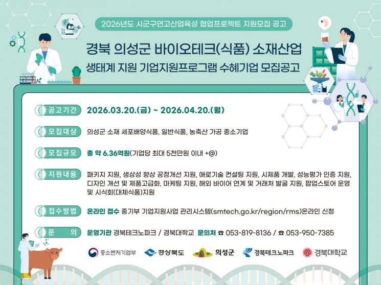 경북TP와 경북대학교 산학협력단은 중소벤처기업부, 경상북도, 의성군이 지원하는 '시군구연고산업육성 협업프로젝트'의 일환으로 '의성군 바이오테크(식품) 소재산업 생태계 지원사업'에 참여할 중소기업을 내달 20일까지 한달간 모집한다고 밝혔다.