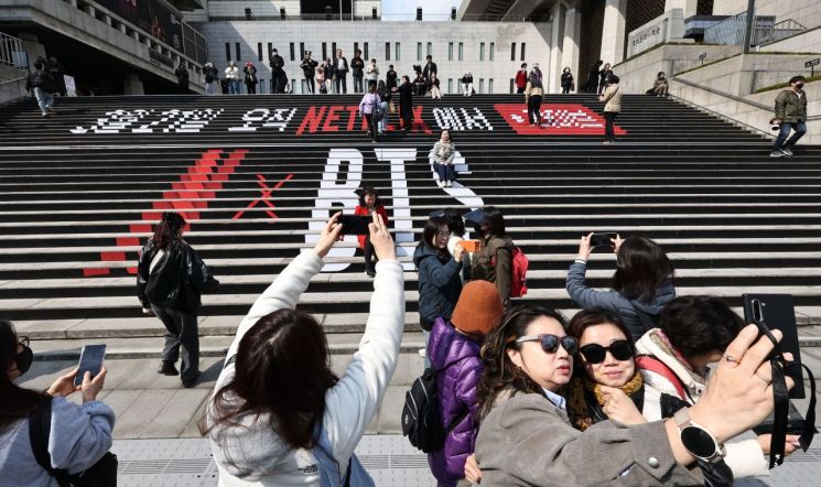 이번 주말 광주와 전남 지역은 아침 기온이 영하권으로 떨어지며 일교차가 매우 클 것으로 예보됐다. 사진은 그룹 방탄소년단(BTS의 컴백 공연을 하루 앞둔 20일 서울 종로구 광화문광장 행사장에서 시민들이 기념사진을 촬영하고 있는 모습. 연합뉴스