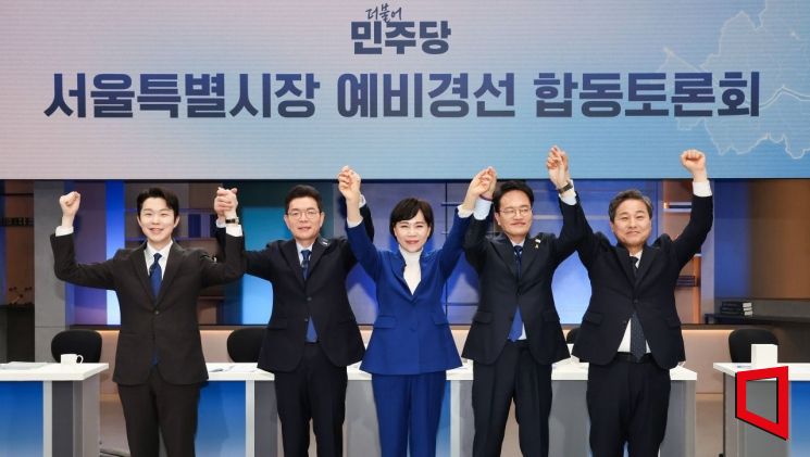 20일 서울 마포구 JTBC에서 열린 더불어민주당 서울시장 예비경선 합동토론회에서 예비후보들이 기념사진을 찍고 있다. 왼쪽부터 김형남, 정원오, 전현희, 박주민, 김영배 예비후보. 2026.3.20 국회사진기자단