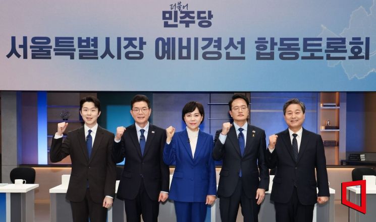 20일 서울 마포구 JTBC에서 열린 더불어민주당 서울시장 예비경선 합동토론회에서 예비후보들이 기념사진을 찍고 있다. 왼쪽부터 김형남, 정원오, 전현희, 박주민, 김영배 예비후보. 2026.3.20 국회사진기자단