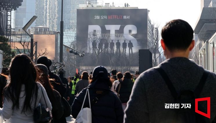 그룹 방탄소년단(BTS)이 정규 5집 발매를 기념해 공연 'BTS 컴백 라이브: 아리랑'(BTS THE COMEBACK LIVE|ARIRANG)을 여는 21일 서울 광화문 공연장으로 관람객들이 들어서고 있다.