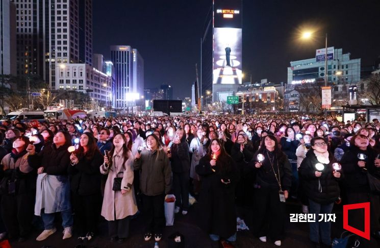 그룹 방탄소년단(BTS)의 팬들이 21일 서울 광화문 일대에서 정규 5집 '아리랑'(ARIRANG) 발매를 기념해 열린 공연 'BTS 컴백 라이브: 아리랑'(BTS THE COMEBACK LIVE|ARIRANG)을 즐기고 있다.