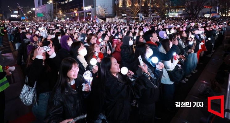 그룹 방탄소년단(BTS)의 팬들이 21일 서울 광화문 일대에서 정규 5집 '아리랑'(ARIRANG) 발매를 기념해 열린 공연 'BTS 컴백 라이브: 아리랑'(BTS THE COMEBACK LIVE|ARIRANG)을 즐기고 있다.
