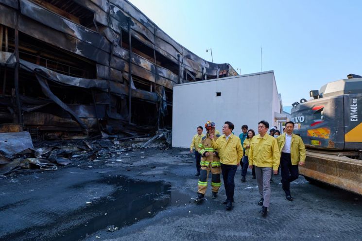붕괴 지점으로 이동한 이 대통령은 화재가 빠르게 확산한 원인을 물으며 신속한 신원 확인을 지시했다. 또 공장 건물의 붕괴 위험 등을 고려해 2차 사고가 발생하지 않도록 안전에 각별히 유의해 달라고 당부하기도 했다.