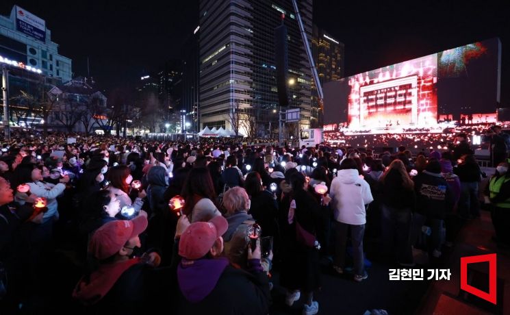 그룹 방탄소년단(BTS)의 팬들이 21일 서울 광화문 일대에서 정규 5집 '아리랑'(ARIRANG) 발매를 기념해 열린 공연 'BTS 컴백 라이브: 아리랑'(BTS THE COMEBACK LIVE|ARIRANG)을 즐기고 있다.