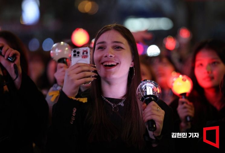 그룹 방탄소년단(BTS)의 팬들이 21일 서울 광화문 일대에서 정규 5집 '아리랑'(ARIRANG) 발매를 기념해 열린 공연 'BTS 컴백 라이브: 아리랑'(BTS THE COMEBACK LIVE|ARIRANG)을 즐기고 있다.