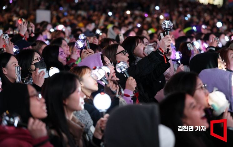 그룹 방탄소년단(BTS)의 팬들이 21일 서울 광화문 일대에서 정규 5집 '아리랑'(ARIRANG) 발매를 기념해 열린 공연 'BTS 컴백 라이브: 아리랑'(BTS THE COMEBACK LIVE|ARIRANG)을 즐기고 있다.